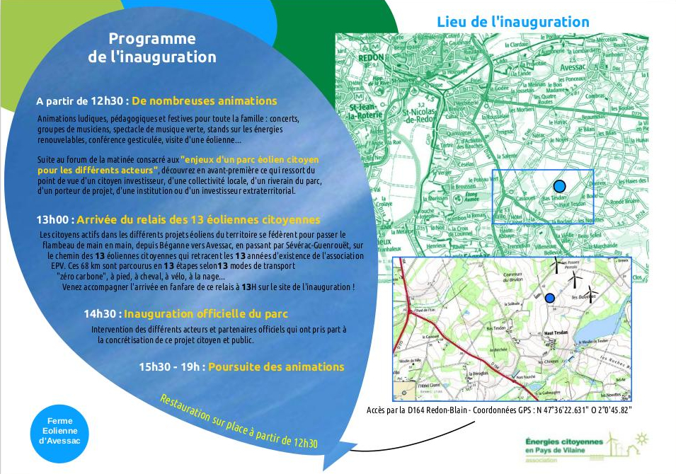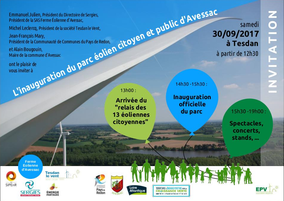 « Tous les Évènements Cet évènement est passé Inauguration du parc éolien citoyen et public d’Avessac 30 septembre 2017 @ 12 h 30 min - 19 h 00 min « Alternatiba Nantes Matinée de réflexion sur la MDE » + Google Agenda+ Exporter vers iCal Détails Date : 30 septembre 2017 Heure : 12 h 30 min - 19 h 00 min